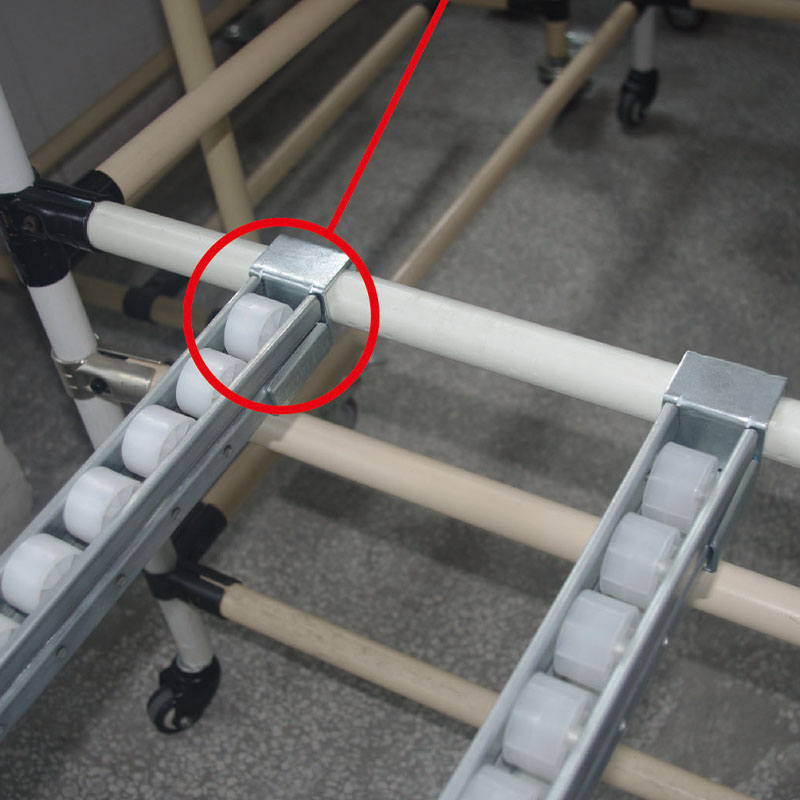 The head of the roller track joint is fastened to the lean pipe, and the tail of the pipe is connected to the roller track. The head of the roller track is parallel to the lean pipe, and the wheels of the slide rail are higher than those of the lean pipe, allowing the goods to be smoothly pushed into the shelf.