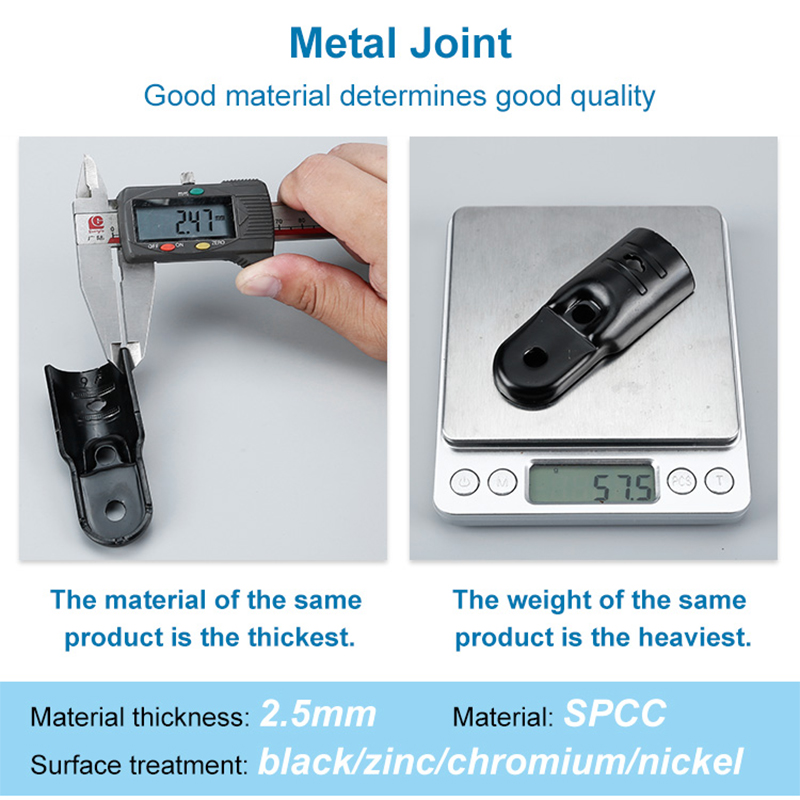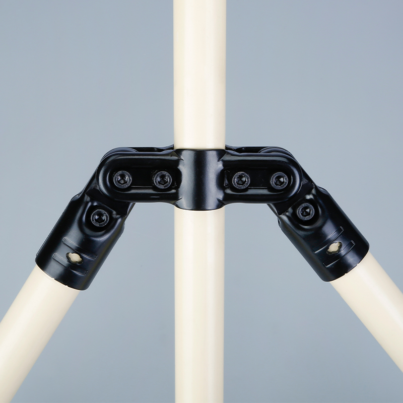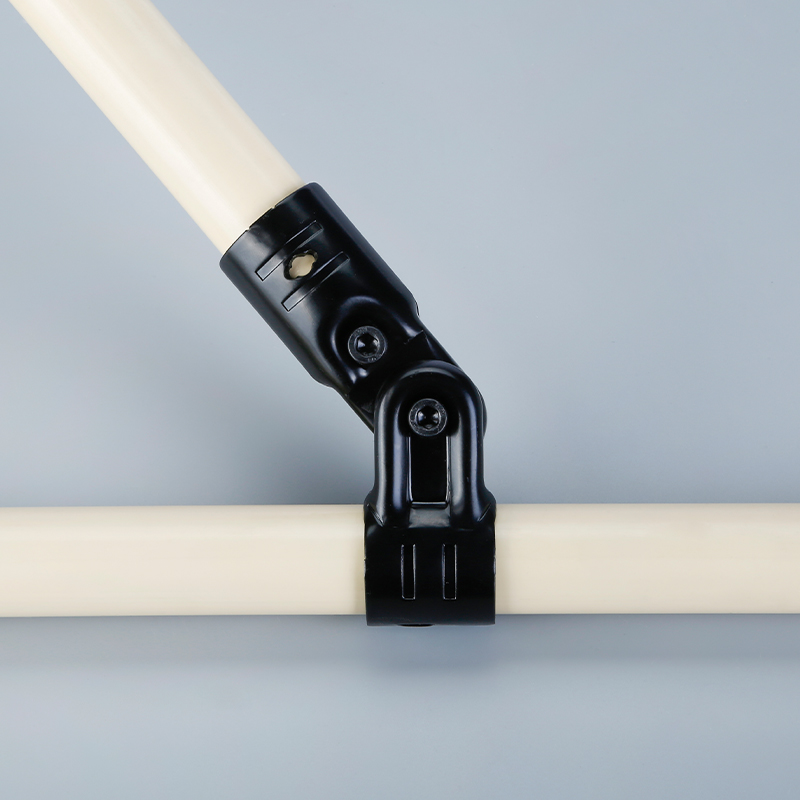 (1) Clamp the tails of two JY-5 pieces against the heads of two JY-6 pieces, and then connect two D28mm lean pipes. It is locked with two sets of M6*25 screw nuts, and the metal joint and lean pipe form a structure that can be adjusted 180°.