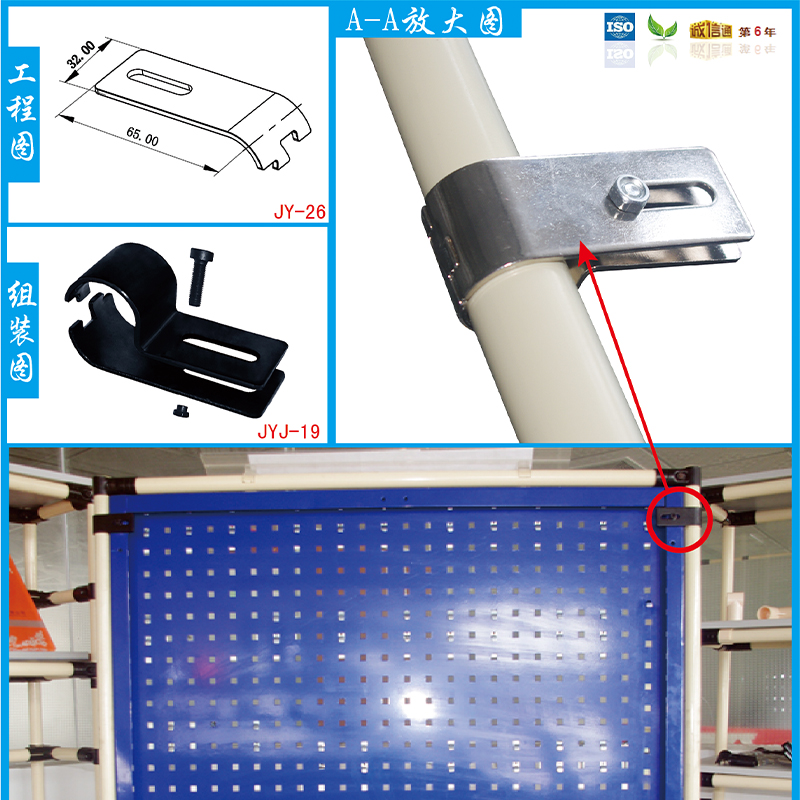 The panel fixing joint has a U-shaped long hole at the tail that can be adjusted. Metal joints can fix workbenches, panels and tool hanging plates on the lean pipe.